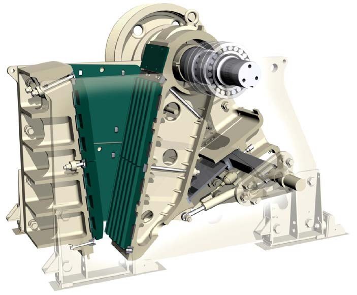 A uniquely modular, non-welded frame construction is a state-of-the-art design with two hot-rolled steel side plates joined to high-quality cast steel frames through robust, precision machined bosses secured with bolts. The pitman is made of high-quality cast steel and is propelled by two massive cast flywheels. A verylarge eccentric shaft forging and four large spherical roller bearings that are all of the same size ensure the greatest reliability. The grease-lubricated bearings are kept free from contamination by means of wellproven labyrinth seals. The single piece cast steel frame bearing housings ensure a perfect fit to the crusher frame. They also prevent unnecessary loads to the frame bearings.